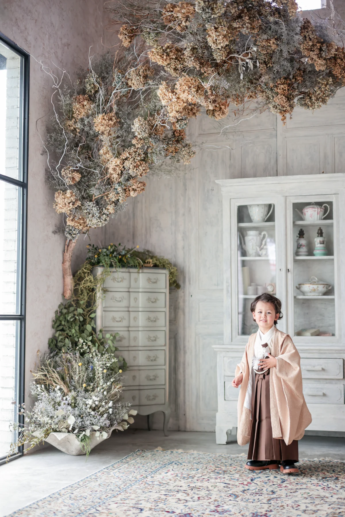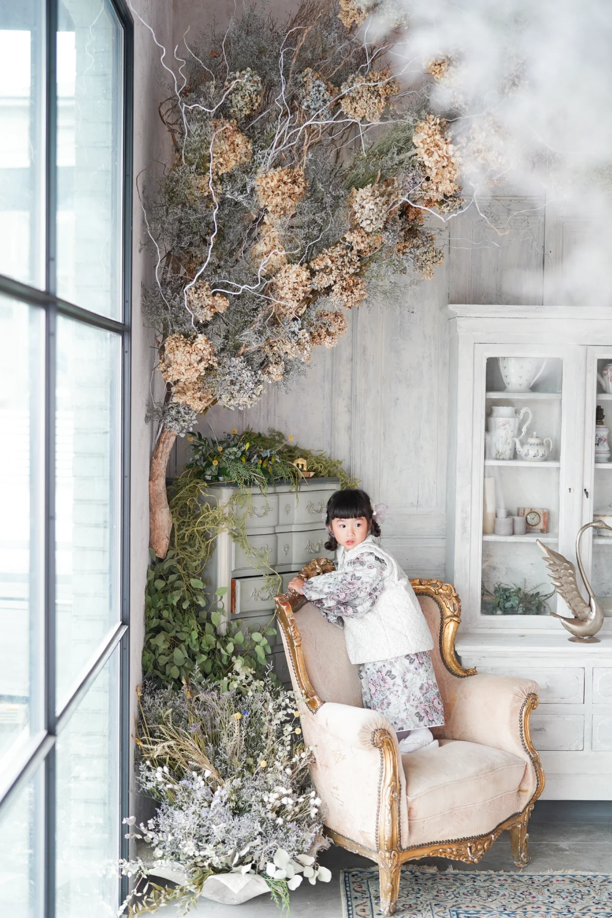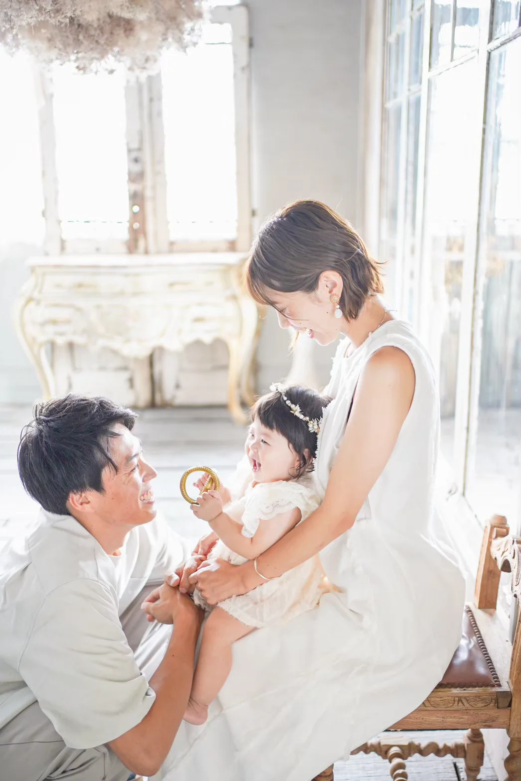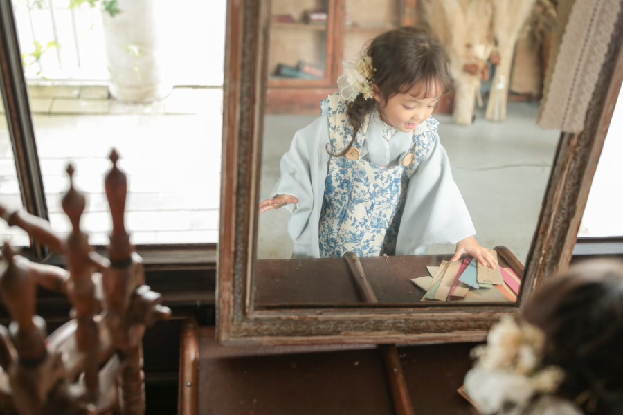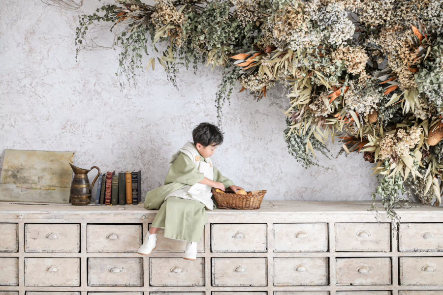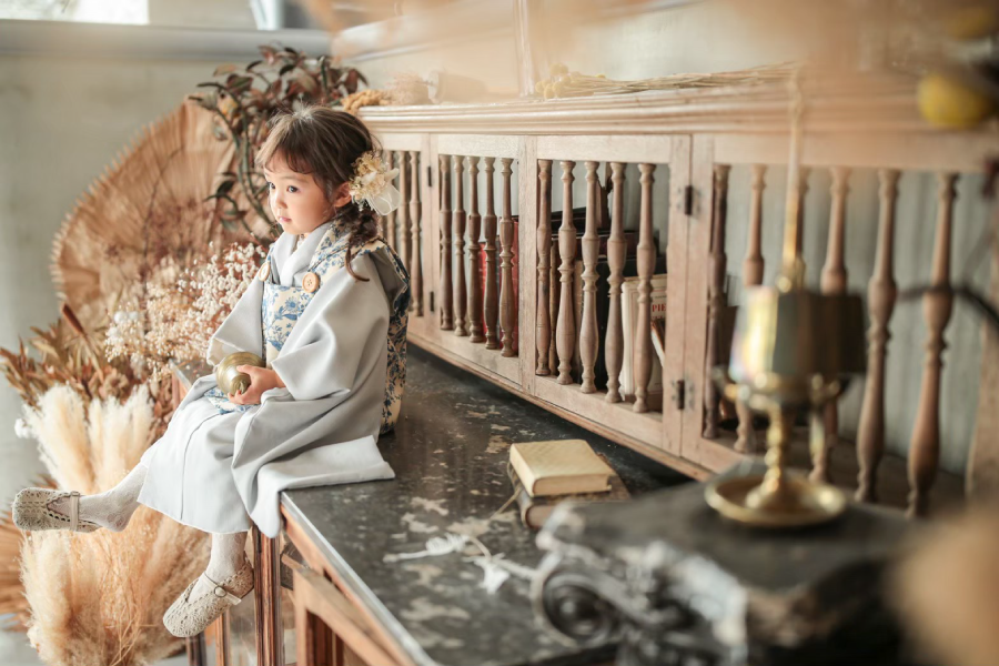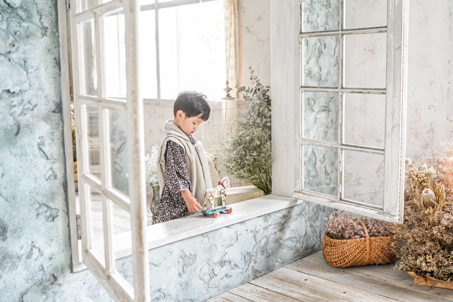 大きな窓から降り注ぐ自然光と、本物のアンティーク家具が調和する空間で、お子様の自然で美しい表情を描き出します。